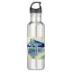 An artistic stainless steel water bottle with a watercolour painting of navy blue and ice white mountain landscape with blush pink clouds atmosphere personalised with a monogram name and initial.