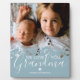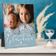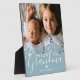 Personalised grandmother photo plaque featuring a precious family photo, a modern dusty blue heart border design, the saying "we love you grandma", and the childrens names.