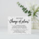 Announce the postponement or cancelation of your wedding ceremony, reception, all or part of your event with this beautiful announcement card "Change of Plans" change of plans postcard card. Modern sleek contemporary white marble background with black handwriting typography lettering is classic and perfect for keeping your guests informed.