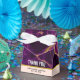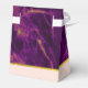 Favour box with a beautiful abstract pattern featuring a marble design. Rich purple colours blending together combined with faux-gold swirling ribbons of colour mixing and mingling throughout the design. A peach coloured layer below the pattern with an elegant faux gold-foil strip between them.