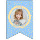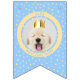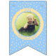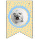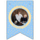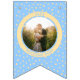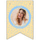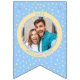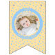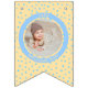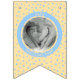 Replace the photos with your own for a fun party decoration and add your name and message. We have written "Welcome Baby" in a modern minimalist typography. It features soft boho colors of pastel yellow and blue and cute bohemian polka dots. It is also the perfect bunting for a nursery or a new baby party bunting flags.
