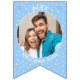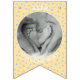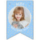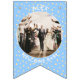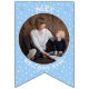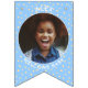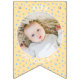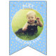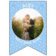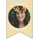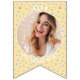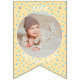 Replace the photos with your own for a fun party decoration and add your name and message. We have written "Welcome Baby" in a modern minimalist typography. It features soft boho colors of pastel yellow and blue and cute bohemian polka dots. It is also the perfect bunting for a nursery or a new baby party bunting flags.