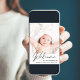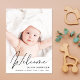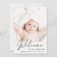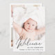 A modern card to announce your baby's birth, featuring his or her photo with "Welcome" written on top in a stylish script. Underneath add his or her name, birth date and birth stats. On the back, add three additional pictures and personalised message.
