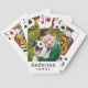 Modern custom playing cards feature a favourite family photo with simple monogram text that can be personalised with a last name. Note, the black text and white background colours can be modified via customise.