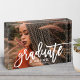 A stylish graduation photo block featuring a full senior portrait with Graduate in flowing white brushed script and the graduate's name and class year in coordinating type. The white script overlay creates a beautiful contrast against any photo, making this a versatile keepsake. Customise with a favourite portrait and details for a meaningful graduation gift.