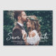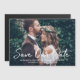 Announce your wedding date to family and friends! This modern wedding save the date announcement card design features a horizontal photo of the engaged couple on the front with a white brushed "Save our Date" calligraphy script overlay and a monogram of bride and groom names and wedding date that can be personalised. Note, the white text colour can be modified.