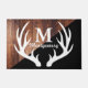 Deep, rich, rustic brown wooden barn planks with a crisp white deer antlers silhouette, black modern diagonal, and your personalised family name and monogram letter.