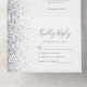 The left-hand edge of this elegant modern all-in-one wedding invitation and RSVP features a silver faux glitter border. The customisable text combines grey whimsical handwriting, copperplate and italic fonts on a white background. The return address appears on the outside flap and the reverse side of the detachable RSVP card in grey text on solid white.