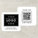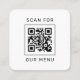 A clean square business card featuring a crisp white background with a framed black logo box, business name, location, and website on the front, paired with a "Scan For Our Menu" QR code on the back. Perfect for restaurants, bars, cafes, breweries, and hospitality venues looking to share digital menus, wifi passwords, or booking links with guests. The logo, business details, and QR code are fully customizable.