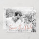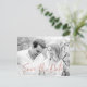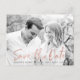 Stylish modern wedding save the date postcards featuring a faux rose gold foil trendy script font overlay, placeholders for your custom text and engagement photo, and white marble background. The back of the postcard features the option for custom text or can be left blank for a handwritten message.