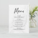 Stylish and modern wedding menu card featuring a black trendy script font, white marble background, and placeholders for your custom wedding menu. The back of the white marble wedding menu can be changed to a colour of your choice with the Customise tool.