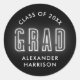 Modern graduation stickers featuring "Grad" in white neon lettering with a black background. Personalize the neon graduation stickers by adding the graduate's name and graduation year. The personalized graduation stickers are perfect to seal graduation envelopes and favor bags! Designed to coordinate with our Modern Neon Graduation Collection.