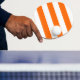Ping pong paddle with white and orange stripes. Customisable. A modern take on a stripe design, it is perfect for the ping pong player in your life.