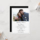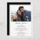 This simple wedding invitation features a horizontal photo on the front and simple text for the invite. The backside is black with a white box containing RSVP directions.