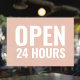 Let your customers know you're always open with this modern blush pink “Open 24 Hours” window cling. Featuring bold white text and a soft contemporary background, this adhesive sign is perfect for cafés, diners, gyms, and other around-the-clock businesses. Easily applies to the inside of glass windows and doors. A stylish, professional way to boost visibility and trust.