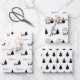 Modern gift wrap set features three coordinating wrapping paper sheets: white deers and fir tree with name, white deers and fir tree with script "Merry Christmas" text, and white fir tree pattern on a black background. You can easily change the black background colour. Matching items available in our store.
