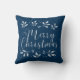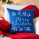 Modern Merry Christmas script throw pillow. The design features the text "Merry Christmas" in white typography with white holly berries and swirl accent elements against a blue backdrop. Makes for the best personalised gift for yourself, your friends, family members and even neighbours. We have 35+ more Christmas pillows in our collection that you will definitely love. Please check it out and get the best Christmas gift with special wishes for your special people. Merry Christmas!
