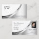 Very elegant white and silver coloured business card design with a noble shimmery silver decor.