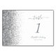 The left-hand edge of this elegant modern wedding table number features a silver faux glitter design. The customisable text combines grey handwriting, copperplate and italic fonts on a white background.