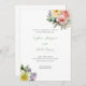 The flowers in the top right corner include shades of pink, yellow, and purple, with light and dark green greenery. Meanwhile, the flowers in the bottom left corner are a beautiful mix of purple and olive green, also with dark green greenery. These floral elements combine to create a unique and captivating invitation that's perfect for any wedding.