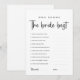 Elevate your bridal shower with our customisable "Who Knows The Bride Best" game card. With a sleek black-and-white design, this minimalist game adds a fun touch to your celebration. Guests can test their knowledge of the bride with personalised trivia questions, making it the perfect addition to your last fling before the ring festivities.