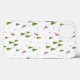 Modern winter themed ski pattern design with skiers on a white snowy hill lined with trees and dotted with snowflakes.