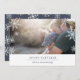 Modern, simple and minimal holiday photo card features your favourite horizontal or landscape orientated photo with a thick white bottom border. Your custom greeting appears in modern midnight blue lettering (shown with "Joyous Hanukkah"), with your family name or names beneath. A subtle snowflake pattern is overlaid over the edges of your photo for festive appeal. Cards reverse to a wintry snowflake pattern in matching midnight blue and white.