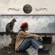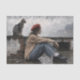 This decoupage tissue paper features a modern woman seated against a weathered brick wall, wearing a red beret and casual contemporary clothing, accompanied by a watchful cat. The muted palette, textured background, and contemplative pose create a calm yet powerful design perfect for statement furniture and artistic decor.