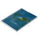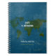 A modern school-or-office blue-notebook, personalised with your own name (or company, brand...), initials and custom lines of text (special subject)... and with a greenish map of the world
