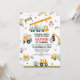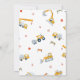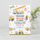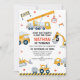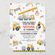 Any age roadworks construction boy's birthday invitation featuring various construction vehicles, cranes, tucks and excavators on a white background. This stop the traffic birthday invitation also features various road signs.