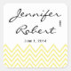 This beautiful and elegant design, called Modern Yellow Chevron Wedding, has a bright white background with a yellow striped chevron pattern at the bottom. In the upper left corner is a place for your initials. This set has invitations, save the date cards, response cards, thank you cards, table number tent cards, envelope seals, wine labels, binders, return address labels and many more day-of wedding stationery pieces, favours, and gifts available. Use the envelope seal stickers for any of your DIY gifts - these are available in both large and small sizes! All elements are printed on our high quality products, they do not include any real gold, jewels, embossing, or other textile elements. All designs are copyright Noteable Expressions, Inc. All rights reserved.