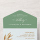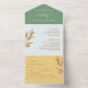 Elegant modern All-in-One Wedding invitation with perforated RSVP in a beautiful colour palette with yellow, green and grey tones. Each section in a different rich tone. Delicate faux gold foil leaves showcasing your details. Environmentally friendly invite as there is no need for extra insert cards, RSVP cards or even envelopes, this invitation has it all! Ability to add both Wedding Ceremony and Reception details, as well as RSVP postcard ready for guests to fill in and mail! Elegant black and white minimalist design with modern hand written calligraphy details. Option to order invitations with printed (or hand write later) guest name on the back so you can mail it with no need of envelopes. If you prefer to use envelopes, simply erase guest name and address characters from text boxes to remove. Attractive modern design ideal for the elegant, yet practical and eco-friendly couple!
