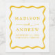 Add a personalised touch to your wedding reception, engagement party, or rehearsal dinner with custom Modern Yellow Wavy Frame wine labels. The design displays your names, wedding date, and wedding location in bold yellow lettering surrounded by a yellow wavy border contrasting with a white background. The retro wine labels coordinate with our Modern Wavy Frame wedding collection.