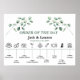A wedding order of the day sign with eucalyptus greenery