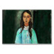 The 1915 painting features a girl in a turquoise dress, sitting in front of a dark green wall.