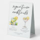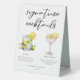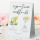 This summer signature cocktails table tent sign features simple black typography above 2 of your favourite drinks and their ingredients for your coastal wedding bar. A chic Mojito and Lemon Drop Martini drawing add a fun flair to your bar menu. Complete with the couple's names and date for their reception.