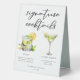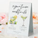 This summer signature cocktails table tent sign features simple black typography above 2 of your favourite drinks and their ingredients for your coastal wedding bar. A chic Mojito and Martini drawing add a fun flair to your bar menu. Complete with the couple's names and date for their reception.