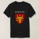 This unique t-shirt showcases a design inspired by the Moldavian coat of arms. Set against a black background, the emblem features a prominent yellow cow's head, symbolising strength and resilience. The design includes a red shield background, accented with a star above the cow, a crescent moon, and a flower, representing Moldavian heritage and culture. This shirt is an ideal choice for those who take pride in their Moldavian roots or appreciate historical symbols.