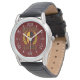 A bold Spartan warrior helmet Molon Labe laurels mask expression on a vibrant burgundy red graphic print decor for a fine custom fashion watch. Come and get them!