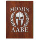 A bold Spartan warrior helmet Molon Labe laurels mask expression. The silver chrome like applique style graphic is placed on a mahogany wood grain decor for a fine custom gift idea. Come and get them!
