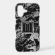 This unique phone case features your monogram in silver on a square black banner with a double silver frame. The banner is placed on an interesting background that looks as if molten silver has been randomly poured upon black, forming an abstract pattern. Beautiful!