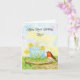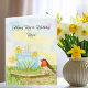 This spring-themed birthday card features a daffodil-inspired birthday cake, the flower of March, with a robin perched on a wooden cake stand, creating a cheerful and meaningful design for a mom's birthday.