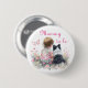 Girl's pink and sage green baby and puppy dog Mommy To Be button. Sweet baby girl sitting next to her little black and white Mini Aussie puppy dog in a patch of pretty watercolor flowers. Pink and sage green butterfly and pretty wildflowers.