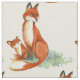 Fabric designed with a watercolor image of a mother and baby fox. The young fox is looking up at her mother with love and appreciation. Both sitting on some grass. Orange and tan colours.