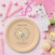 A Cute watercolor bee themed party napkin style for your baby shower, featuring a bee with a honey dipper, surrounded by a floral wreath, all in soft honey and blush tones on a peach background. The playful illustration sets the tone for a warm, whimsical bee baby shower that feels light, modern, and charming. Personalize with the mommy to bee’s name.