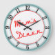 Moms Diner in neon red letters on a fun cooking decor kitchen wall clock, with black numbers on a light teal background giving this design a retro, 1950's faux-neon restaurant look.