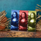 Da Vinci's masterpiece times three (x3), set off in the primary colours of red, yellow and blue... with thin vertical streamers of animal print.