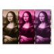 Da Vinci's masterpiece times three (x3), set off in colours of chocolate brown, raspberry, and plum purple... with thin vertical streamers of animal print.