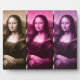 Da Vinci's masterpiece times three (x3), set off in colours of chocolate brown, raspberry, and plum purple... with thin vertical streamers of animal print.