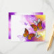 Orange, detailed monarch butterflies on light, purple, picturesque, painted background.